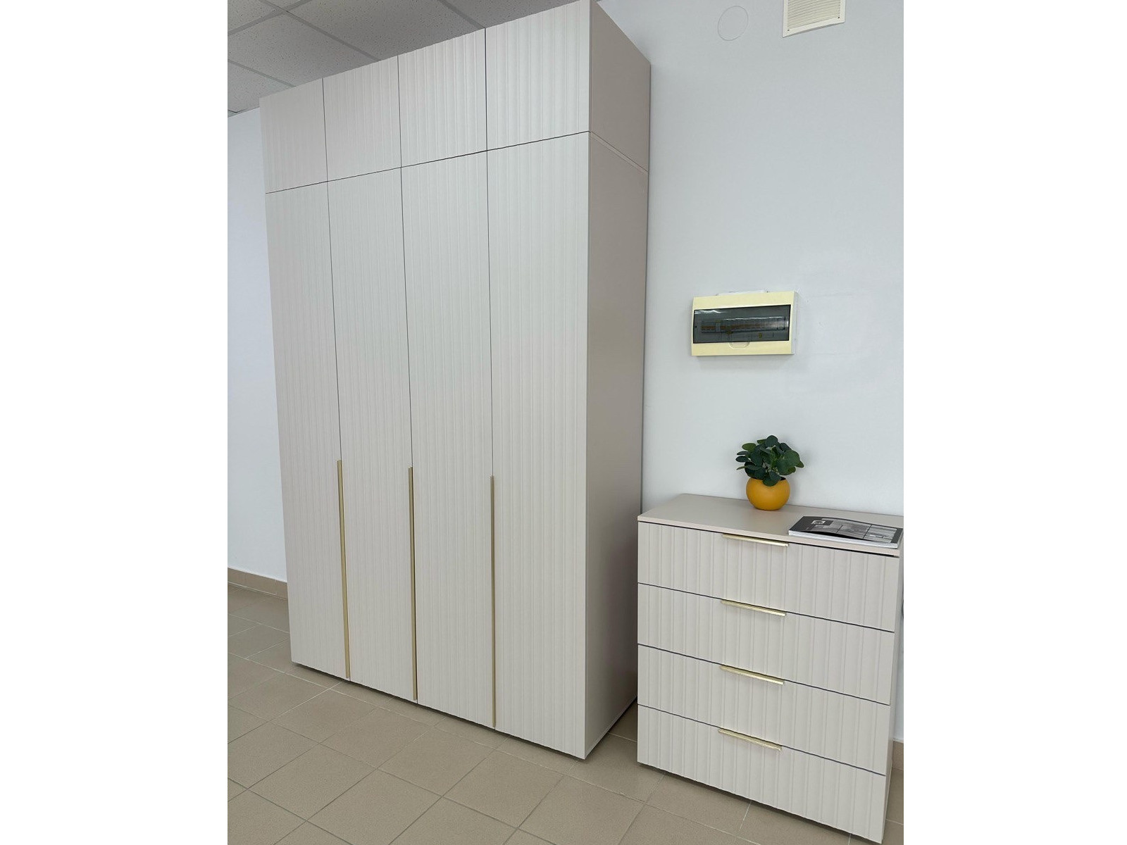 - Фасад: МДФ с фрезеровкой, плёнка ПВХ Софт Сантьяго, толщина 320-350 микрон МКМ (с праймером)