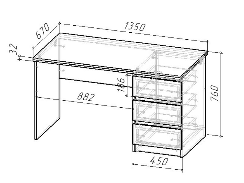 Стол письменный СП-001 состоит из тумбы с 3-мя ящиками, рабочего места и крышки стола: