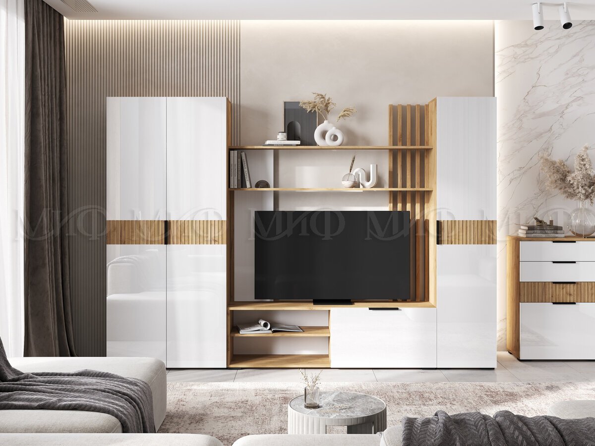 - Гостиная модульная Роджина Белый глянец, Дуб крафт