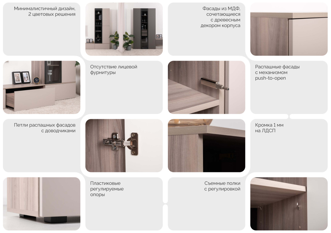 Цена за комплект: Тумба под ТВ 16.54.01 (2 шт), Тумба под ТВ 16.54.02, Шкаф навесной 16.322.01 (2 шт), Шкаф-витрина навесной 16.322.02(2 шт)