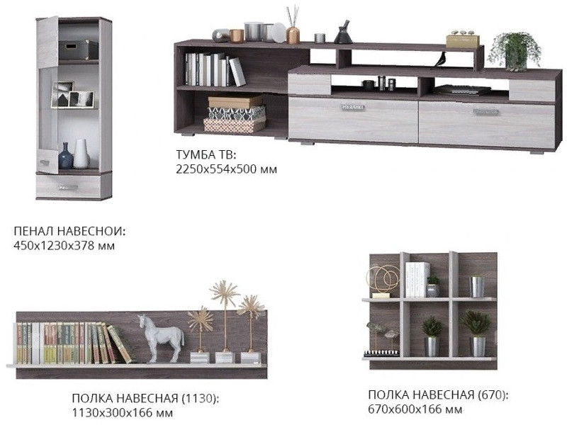 Гостиная состоит из: Пенала - 1 шт, полка 670 - 1шт, полка 1130 - 1 шт и тумба ТВ.