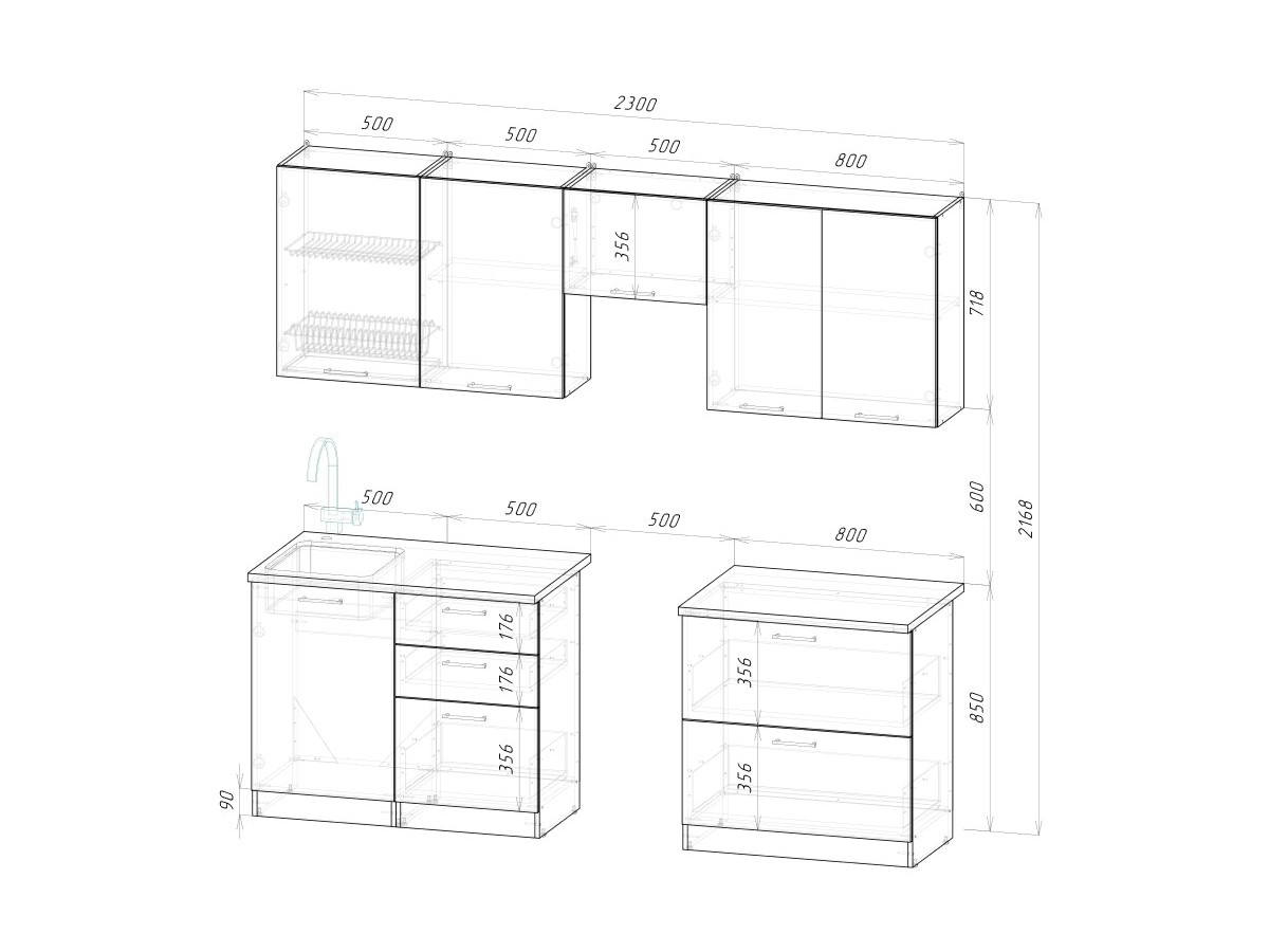 Мойка, смеситель, стеновая панель и посудосушитель в комплект гарнитура не входят.