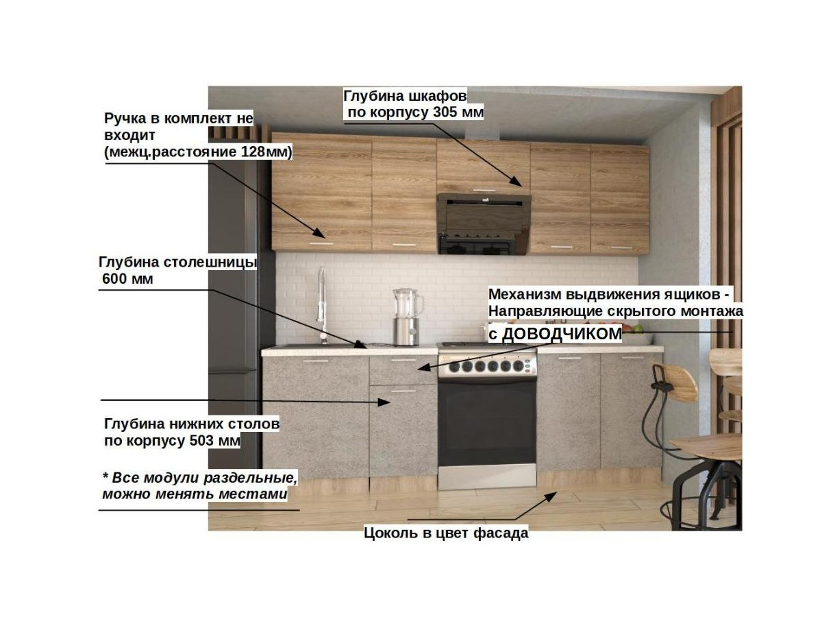 Кухонная мойка, стеновая панель, посудосушитель, планки для столешницы в комплект не входят.