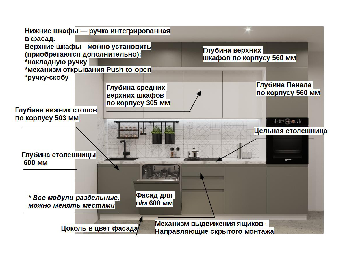 Кухонная мойка, стеновая панель, посудосушитель, планки для столешницы в комплект не входят.