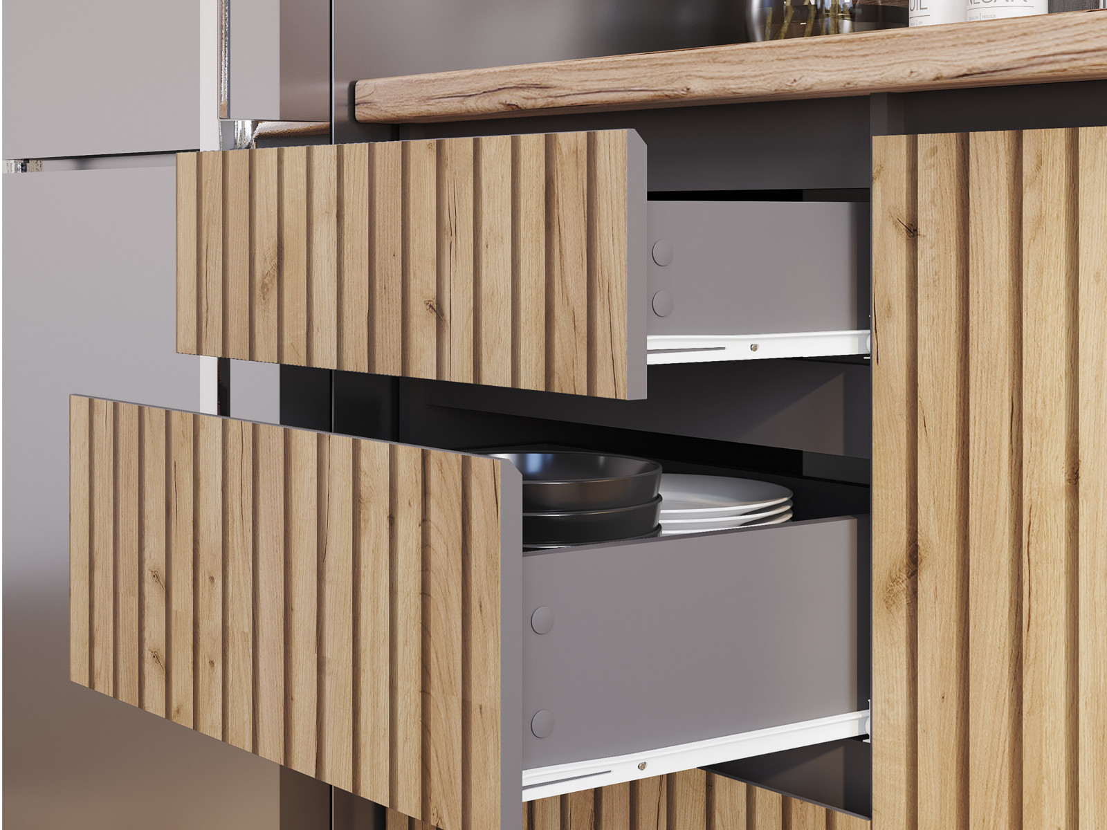 Универсальный дизайн кухни "Шерлок" легко адаптируется под различные интерьерные решения. Фотопечать "рейки" создает иллюзию фактурности. Высокие ножки позволяют без труда поддерживать чистоту на кухне с помощью робота-пылесоса.
