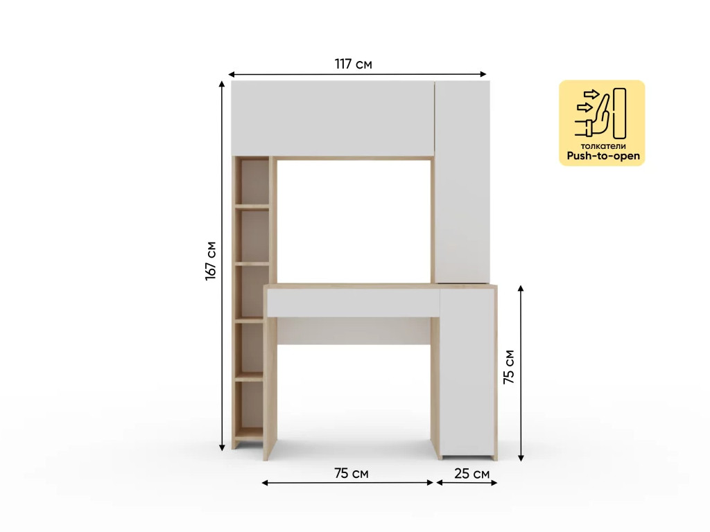 Вертикальные дверки оснащены системой push-to-open. Для открывания достаточно легкого нажатия на фасад. Закрываются аналогичным нажатием. Ручки не требуются.