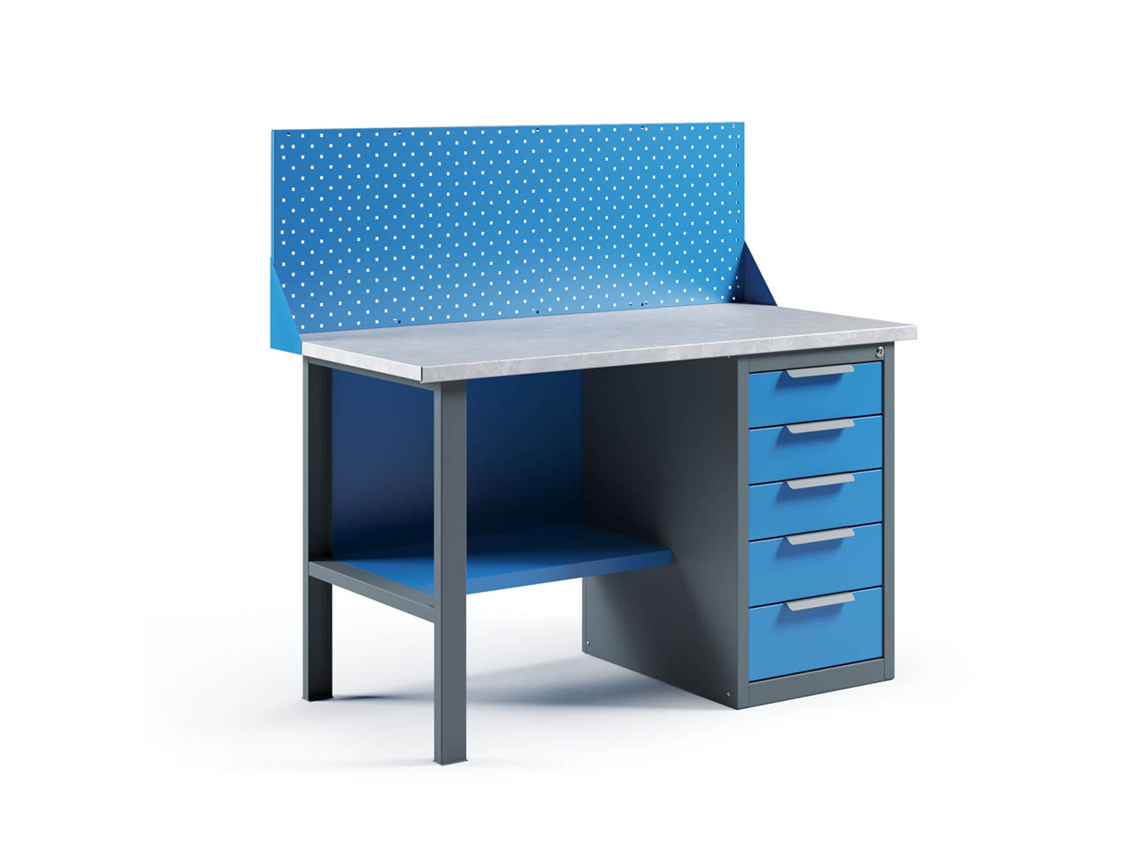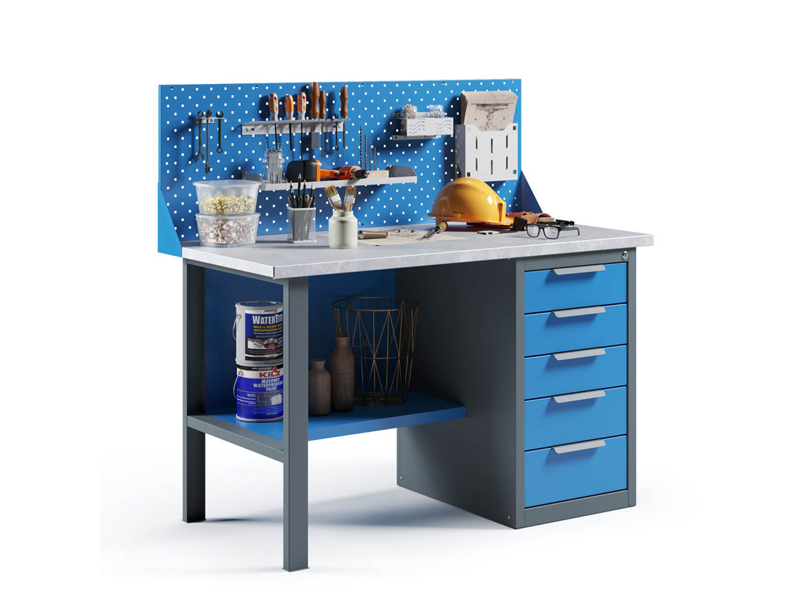 Верстак имеет надежную модульную конструкцию с усиленной столешницей (плита МДФ 25мм, покрытая листом оцинкованного металла).
