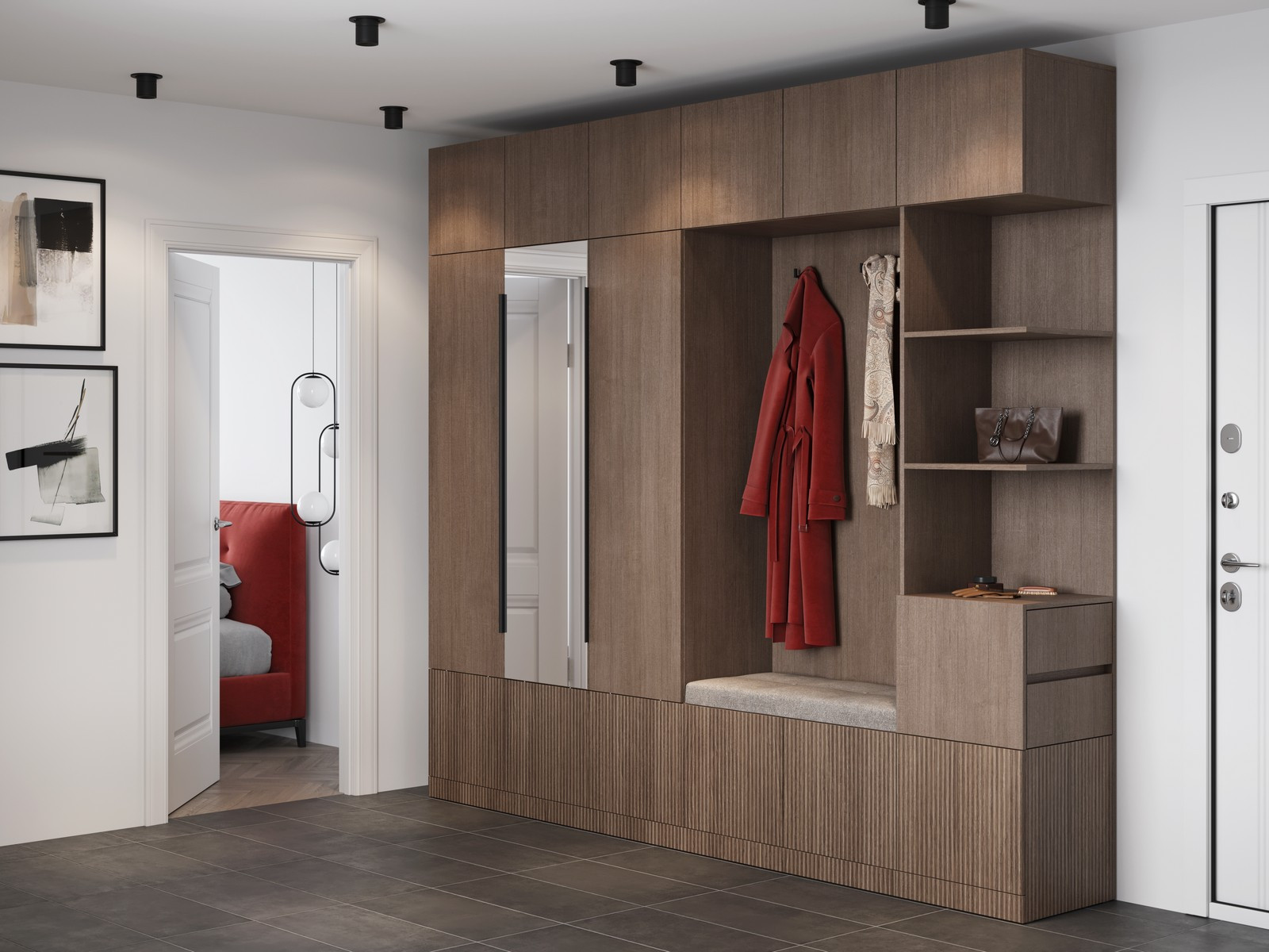 Первая часть расположена вверху, закрывается фасадом ЛДСП в цвет корпуса. Створка открывается при помощи отталкивателя. Общий габарит данного отсека Д.418 х В.368 х Г.426 мм.