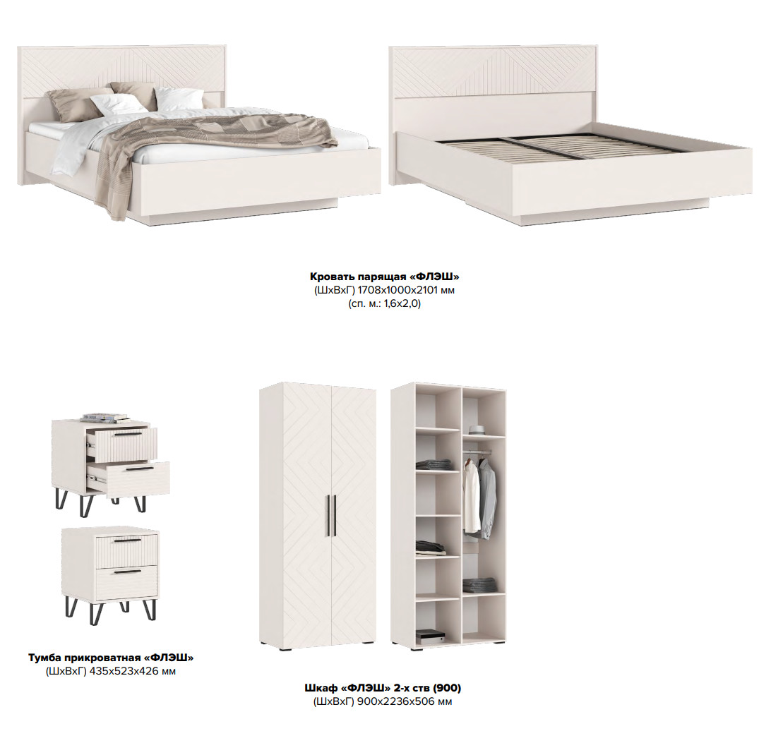 Цена за комплект: Кровать парящая 1,6м (ортопед дерево), Шкаф 2-х створчатый, Тумбы прикроватные