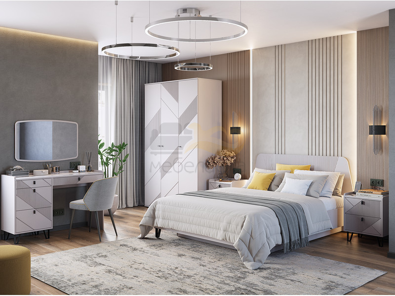 Цена за комплект: Зеркало, Туалетный столик, Тумба прикроватная (2шт), Шкаф 3х дверный, Кровать 1400 спинка МДФ, Основание для кровати ЛАЙТ 1400