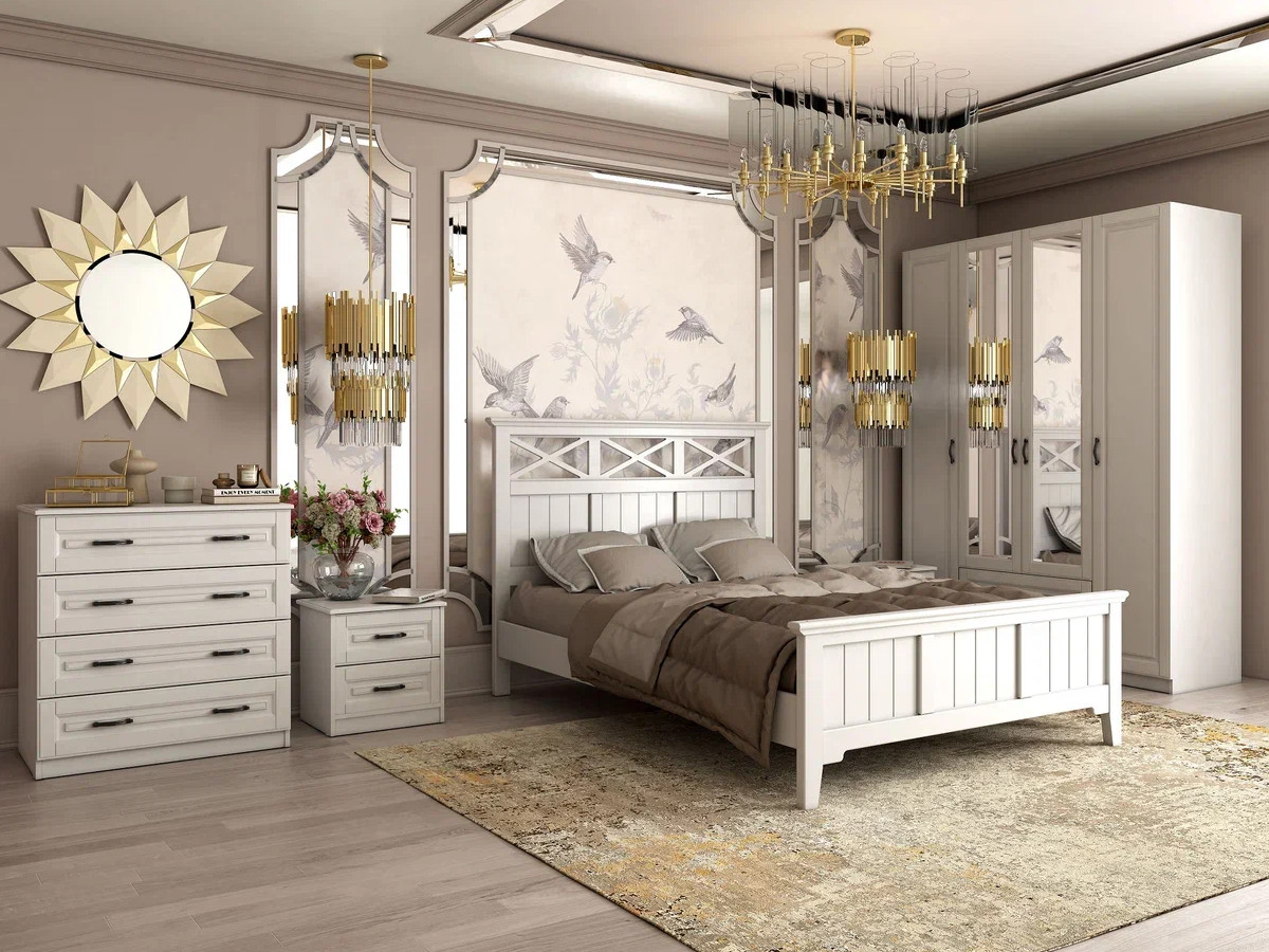Цена за комплект: кровать ГРАЦИЯ-5 1400 мм, Комплектующие на кровать с ламелями 1400 мм, шкаф ШР-4 2 зеркалом, комод 4 ящика, тумба прикроватная