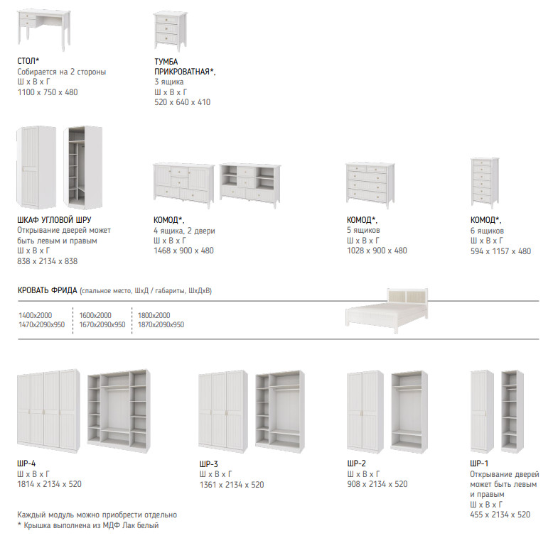 Цена указана за комплектацию на фото: комод 5 ящиков, Тумба прикроватная (2 шт), кровать Фрида 1400, Комплектующие на кровать с ламелями 1400 мм