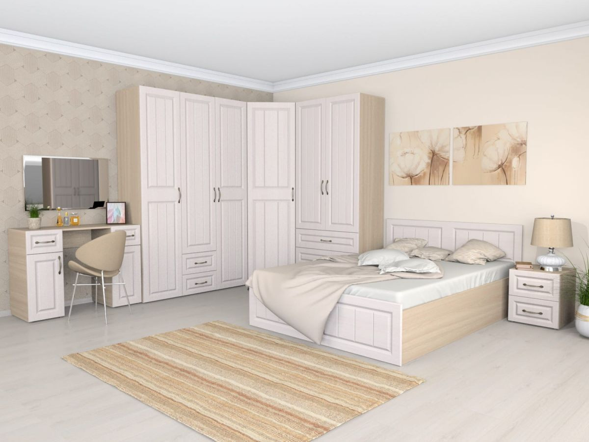 Состав комплекта: зеркало навесное-800, стол туалетный, шкаф 3-х ств. с зеркалом, шкаф угловой, шкаф универсальный, тумба прикроватная , кровать-1400 , орт. основание 1400х2000, опоры основания