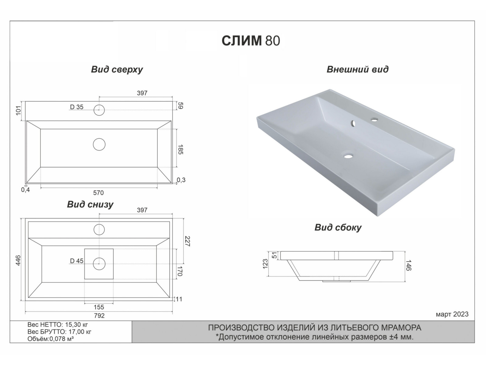 Тумба Леон 80 подвесная 2 ящика раковина Слим 80 оникс