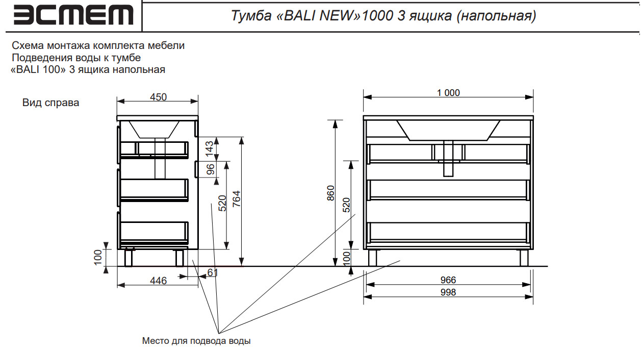 - Тумба с раковиной Bali new 1000 напольная 3 ящика