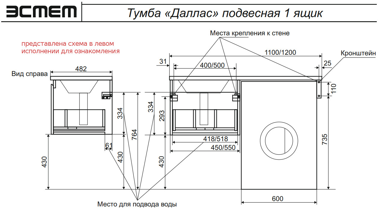 Тумба с раковиной Dallas Luxe 1200 навесная 1 ящик правая
