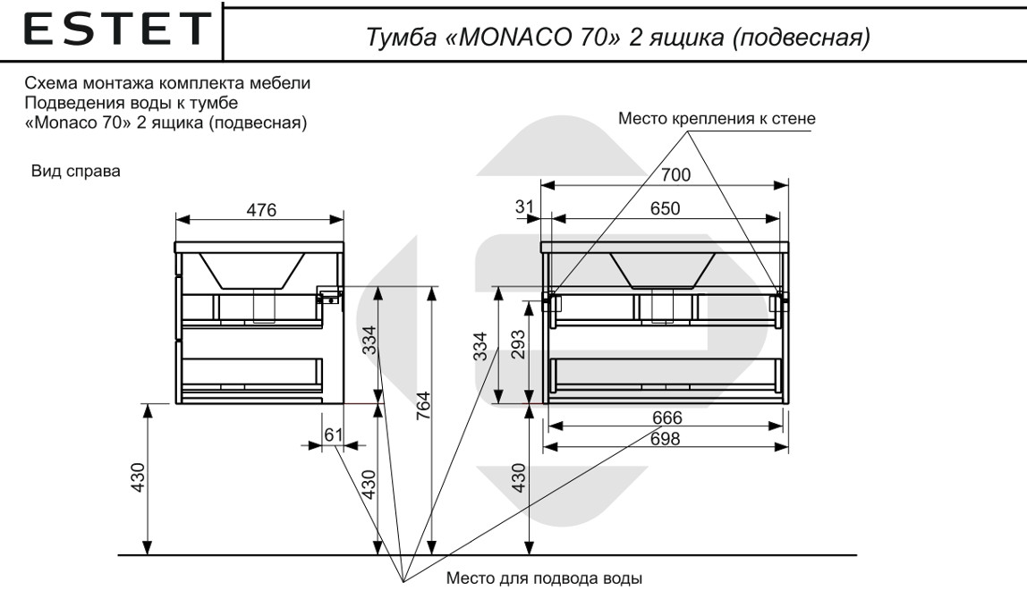 - Тумба с раковиной Monaсo 700 навесная 2 ящика