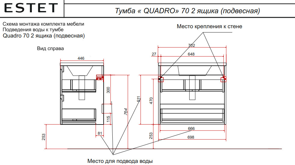 - Тумба с раковиной Quadro 700 навесная 2 ящика
