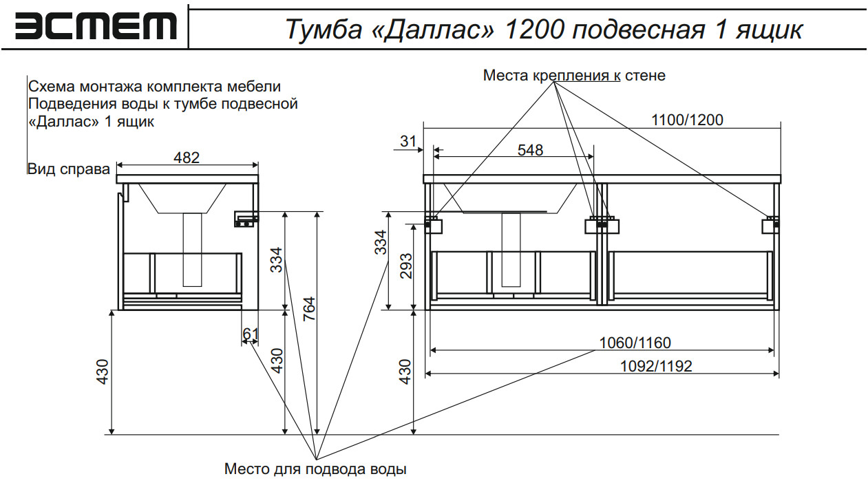 - Тумба с раковиной слева Dallas Luxe 1200 навесная 1 длинный ящик