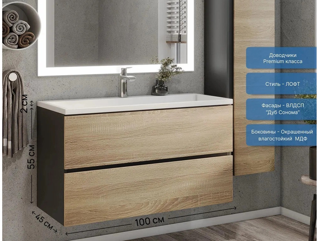 Фасад - ЛДСП в пленке под дерево, цвет дуб сонома. Выдвижные ящики изготовлены из влагостойкой ЛДСП. Ящики оснащены доводчиками. Фурнитура и доводчики премиум класса.