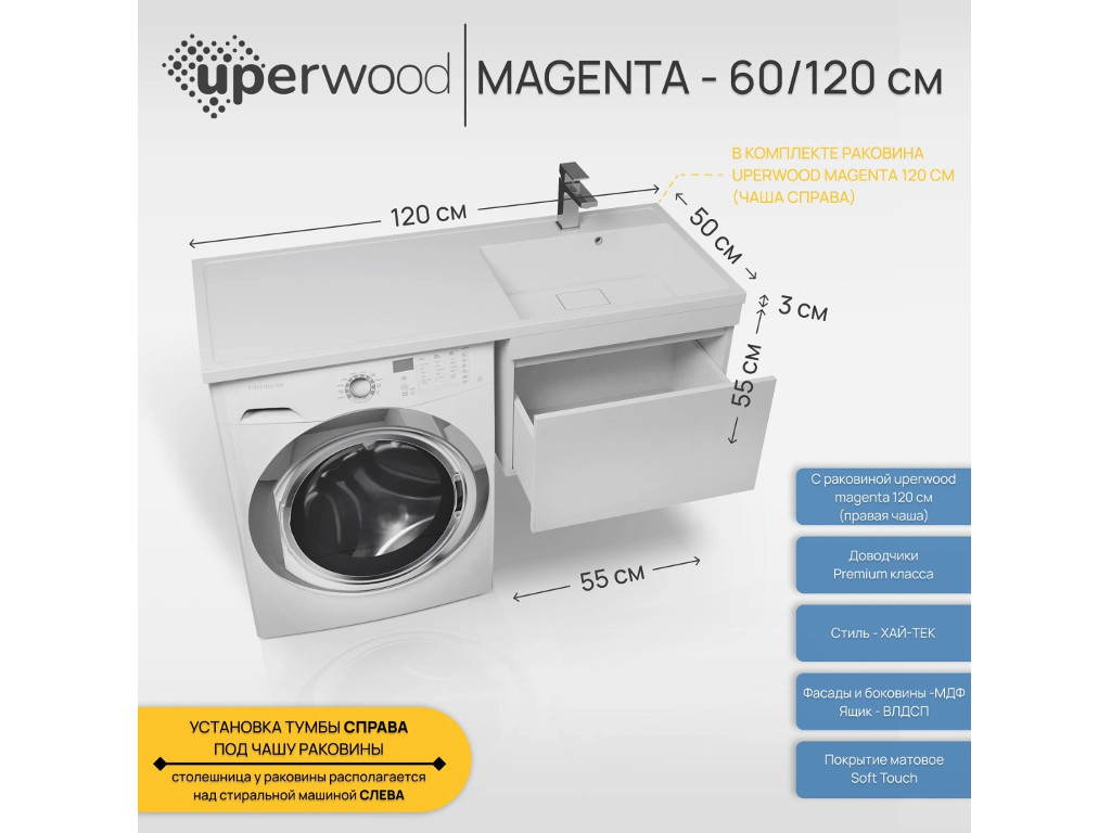 - Тумба с раковиной Uperwood Magenta 60-120 см подвесная белая выдвижной ящик правая