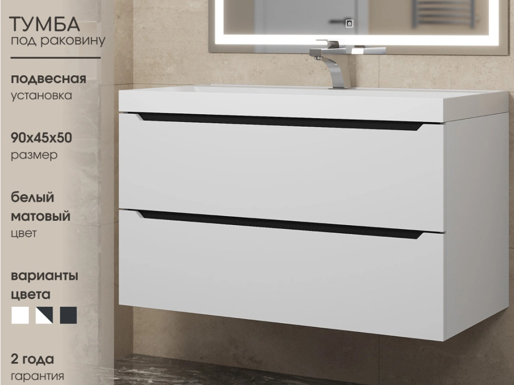 - Тумба с раковиной Uperwood Tanos матовая белая/графит 90 см