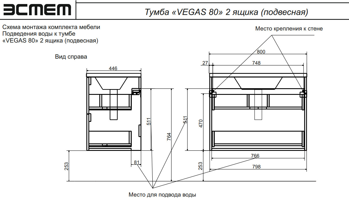 - Тумба с раковиной Vegas 800 навесная 2 ящика
