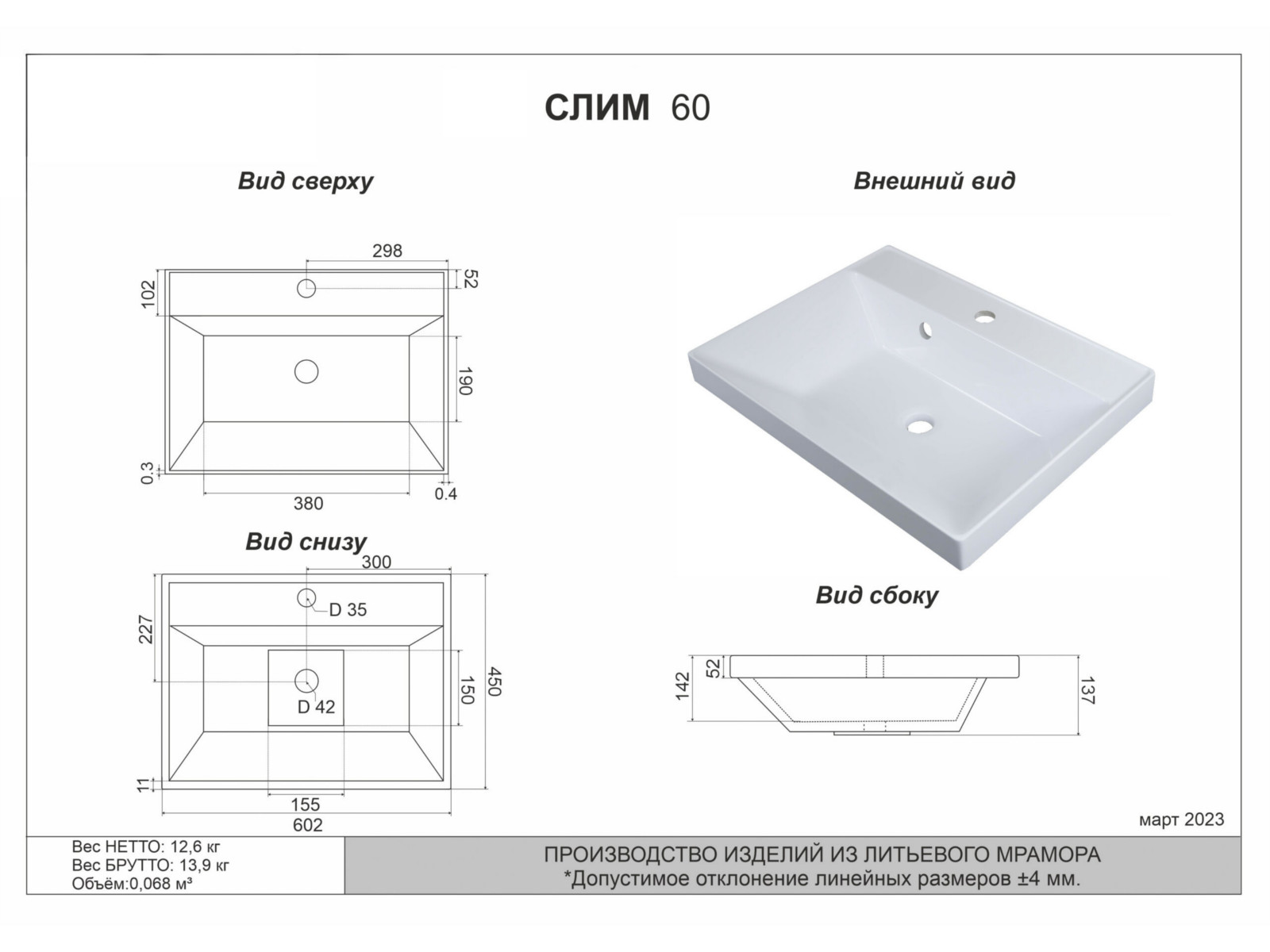 - Тумба Сохо 60 подвесная 2 ящика раковина Слим 60