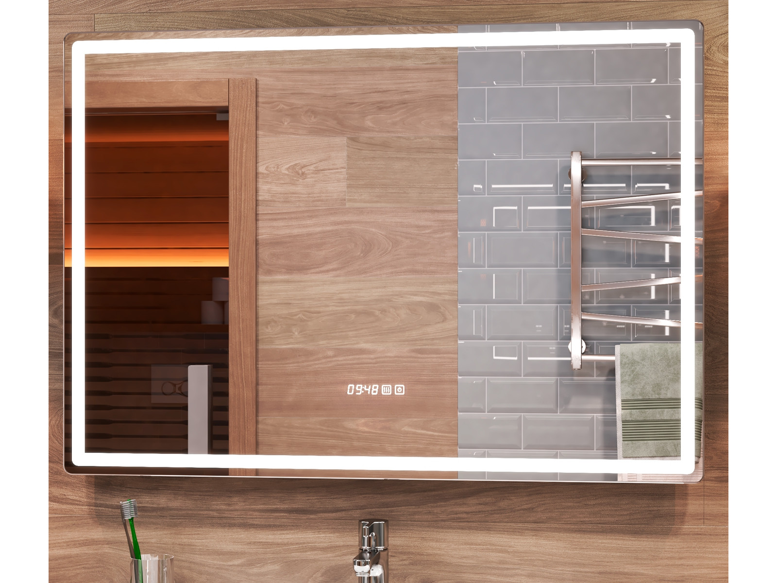 Оснащение: LED подсветка по периметру, сенсорное управление, часы, функция