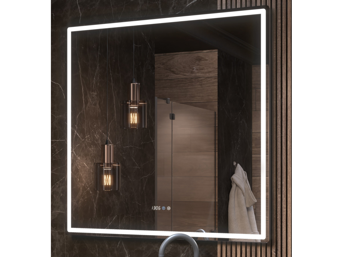 светодиодная подсветка по периметру; сенсорное управление; встроенные часы;функция антизапотевания с таймером отключения