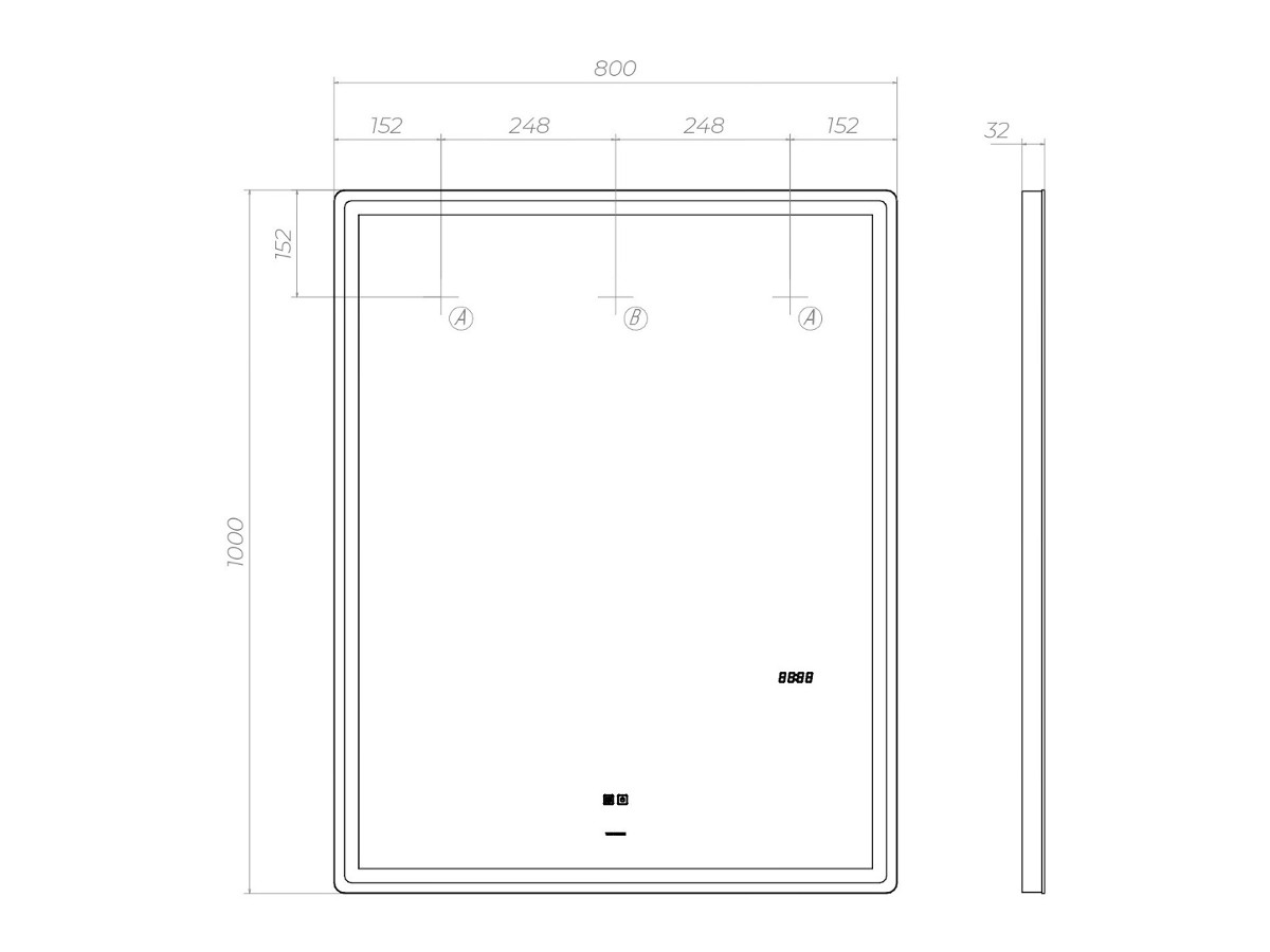 светодиодная подсветка по периметру; сенсорное управление; встроенные часы;функция антизапотевания с таймером отключения