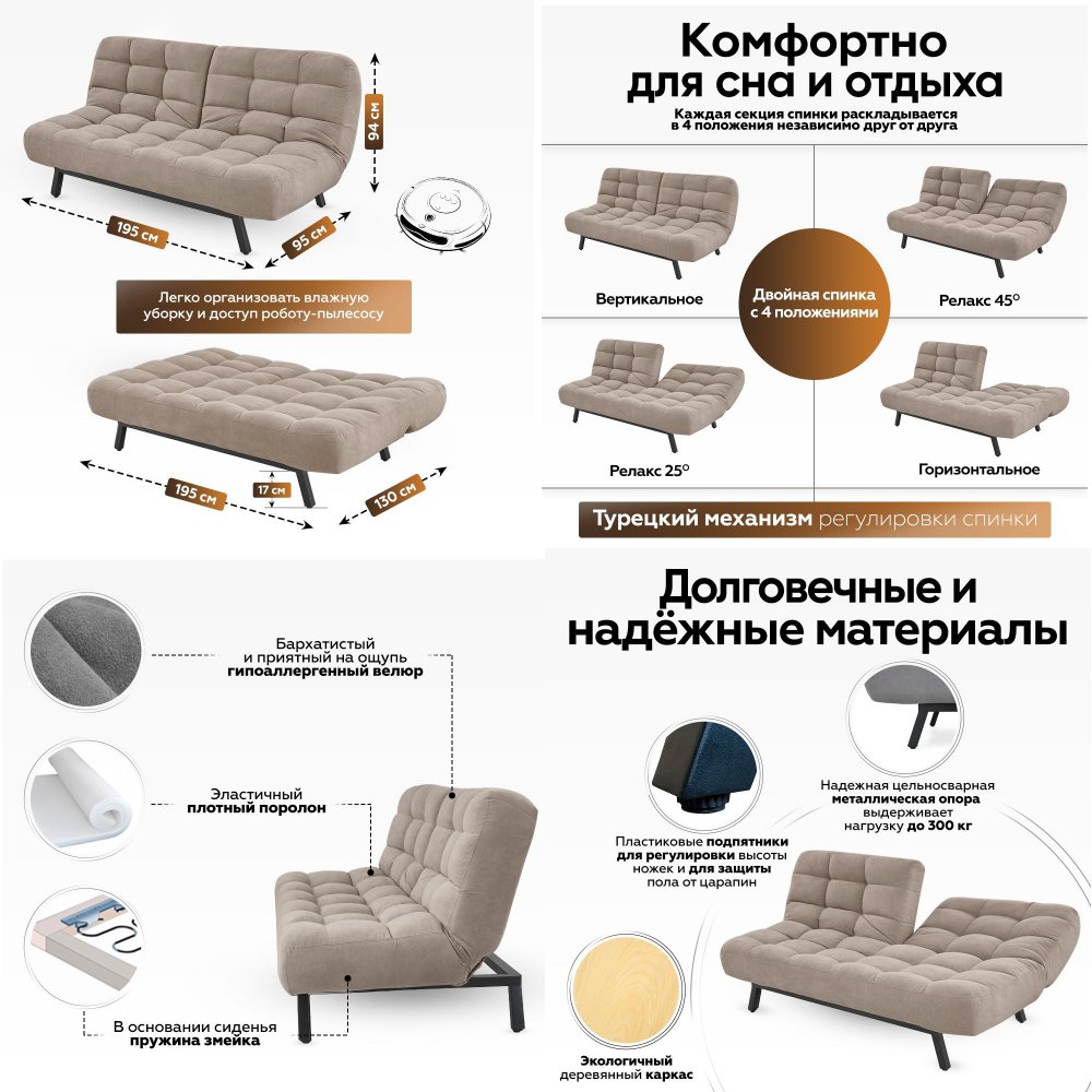 Встроенный механизм «клик кляк» позволяет трансформировать диван в 3 положения:
