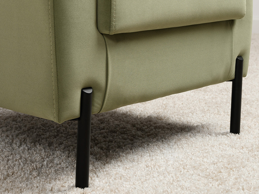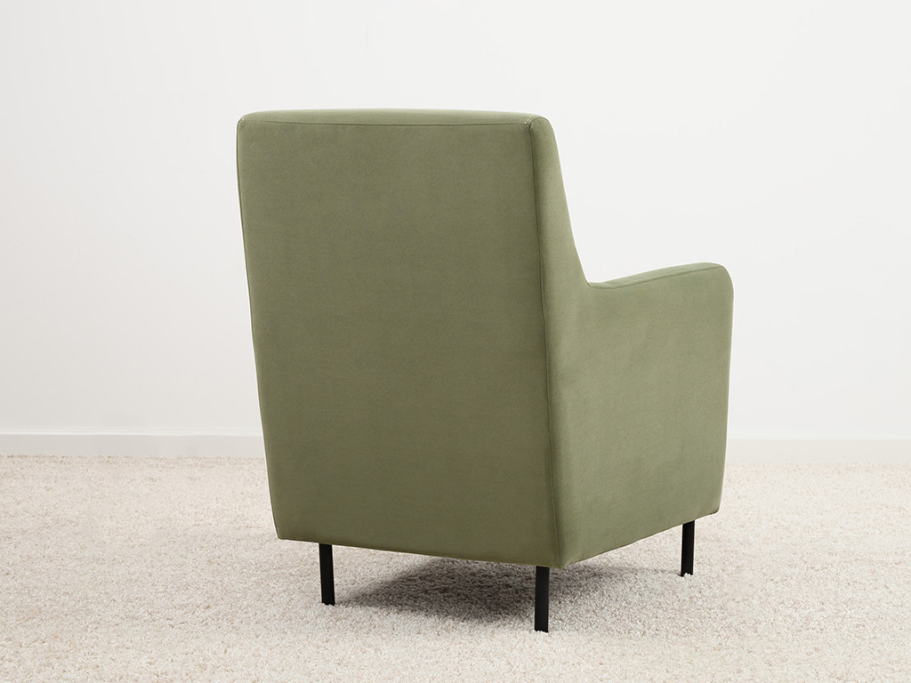 Декоративная утяжка на спинке кресла, декоративная подушка в цвете кресла, металлические опоры переходят в декоративный элемент подлокотника