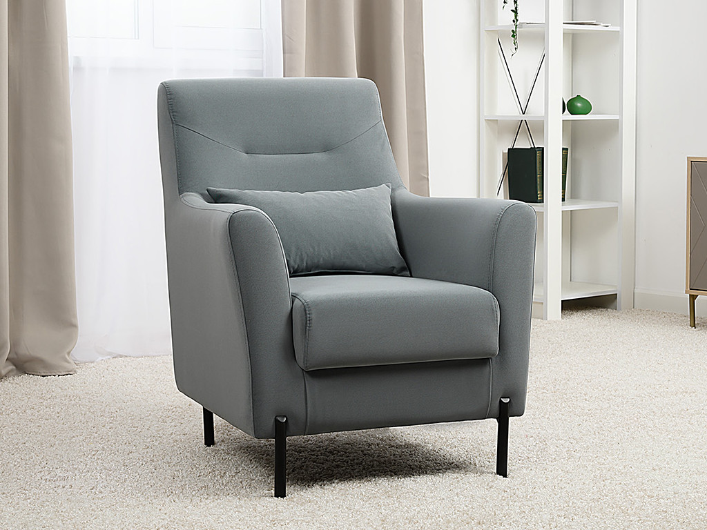Декоративная утяжка на спинке кресла, декоративная подушка в цвете кресла, металлические опоры переходят в декоративный элемент подлокотника