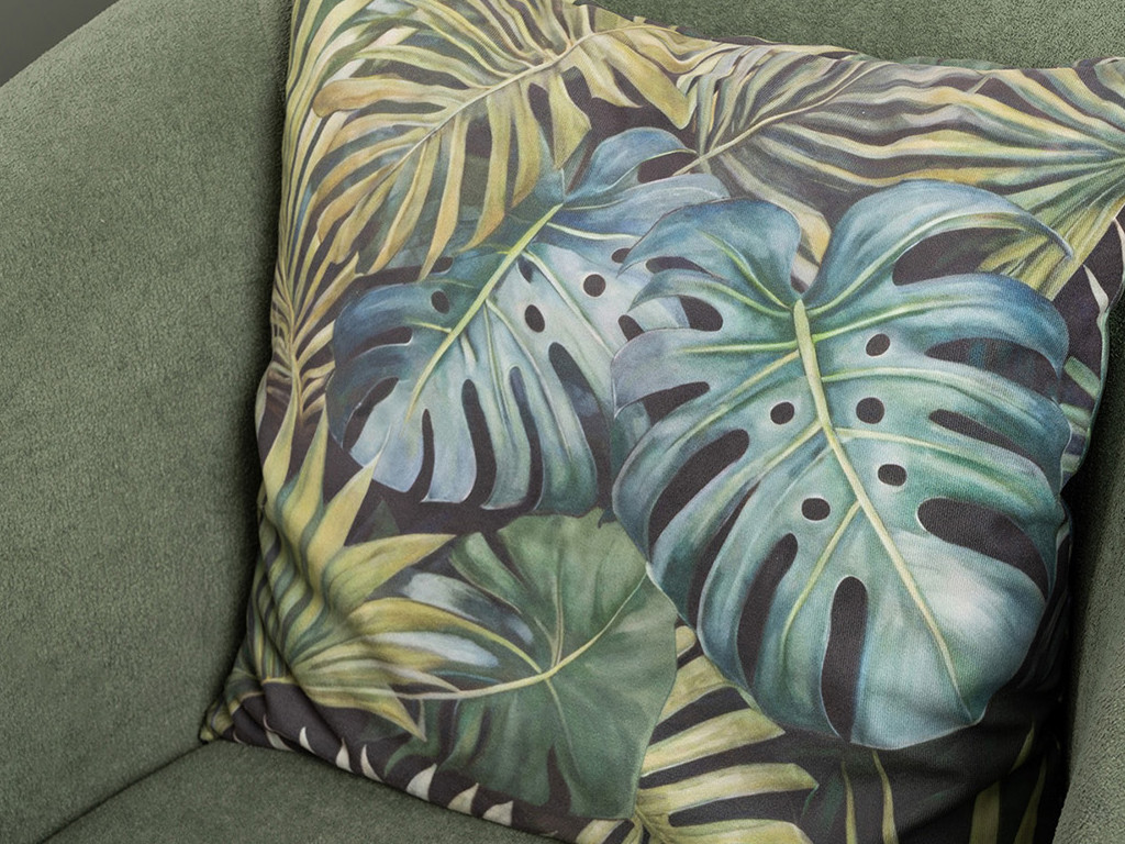 Кресло для отдыха на деревянных опорах. Спинка округлой формы переходящая в боковины. Кресло с подушкой думкой квадратной форы из ткани компаньон.