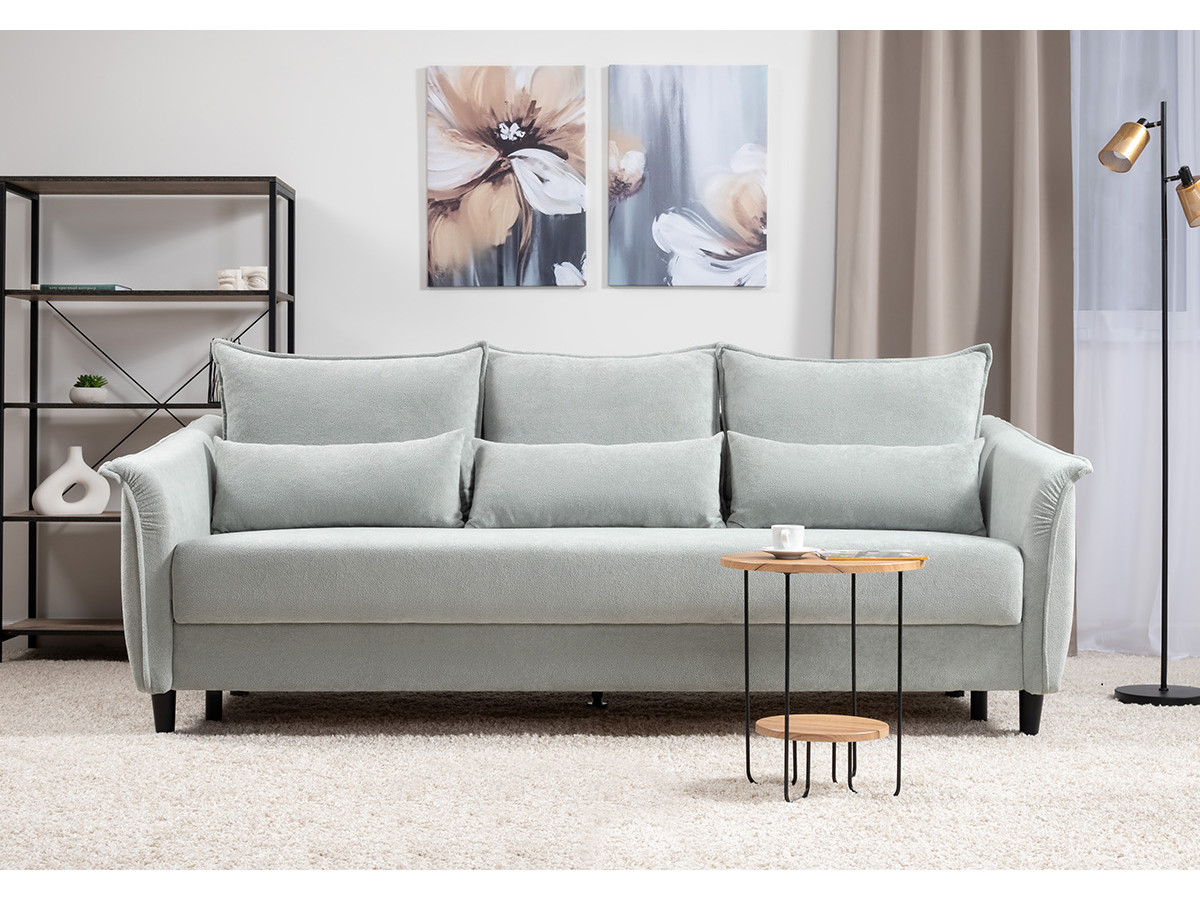Спинка с тремя приспинными подушками. Две подушки трапецивидной формы, центральная квадратной формы на молнии, по трем сторонам которых проложена отделочная строчка на 1,2 см. По контуру боковин проложен декоративный кант на 1,2 см из основной ткани. Кант проходит по центру передней части боковины, а по внутренней верхней части сборка.