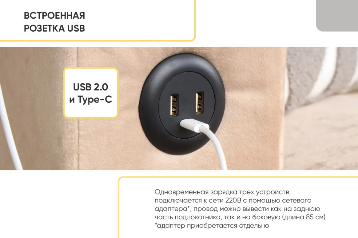 Длина провода от дивана - 85 см. USB2.0. и type-c.
