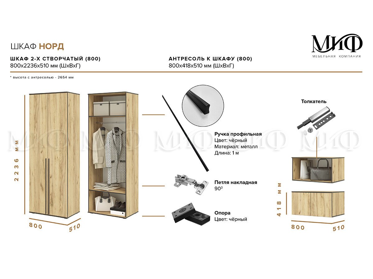 - Шкаф двухстворчатый Норд 800 с антресолью дуб крафт МГ