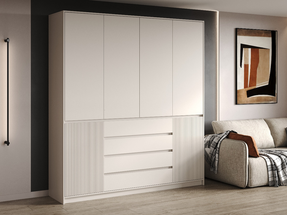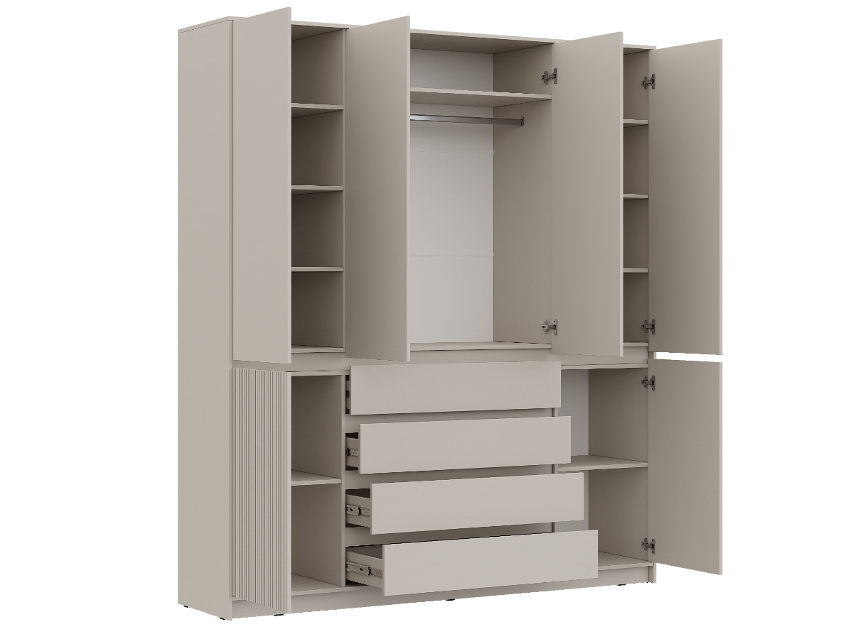 - Верхняя часть шкафа закрывается створками ЛДСП в цвет корпуса, нижняя фасадами МДФ с фрезеровкой. Створки, которые устанавливаются на перегородки, комплектуются полунакладными петлями. На боковины створки крепятся внутренними петлями.