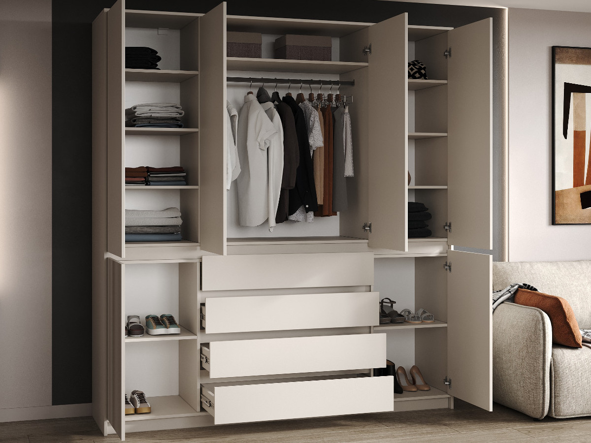 - Для открывания створок предусмотрен зазор 30мм, который скрыт изнутри планкой ЛДСП в цвет корпуса. Расстояние от пола до верха нижних створок 961мм, от пола до нижней части верхних створок 991мм.