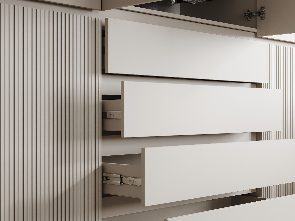 - В центре нижней части шкафа расположены ящики. Фасад ящиков изготовлен из ЛДСП корпуса.