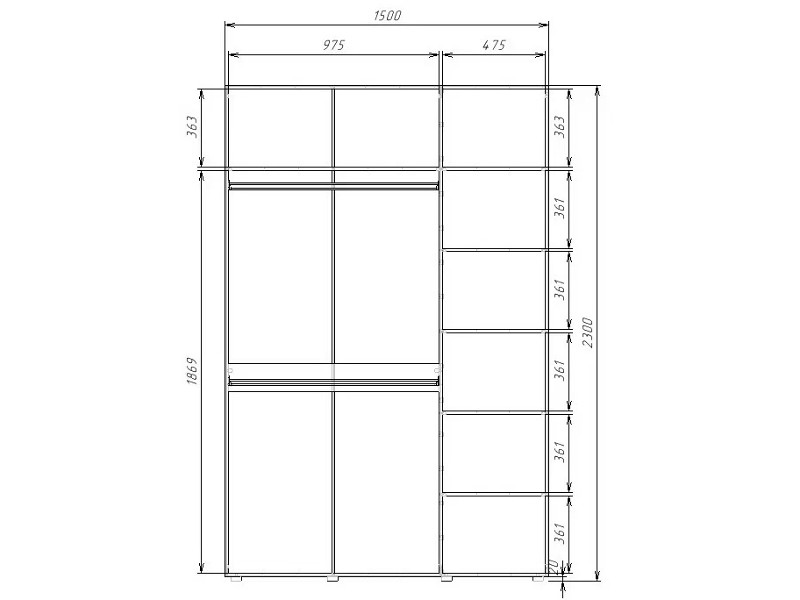- Шкаф комбинированный с полками справа и 2 штангами Гранд ГШК/2-23-15-333