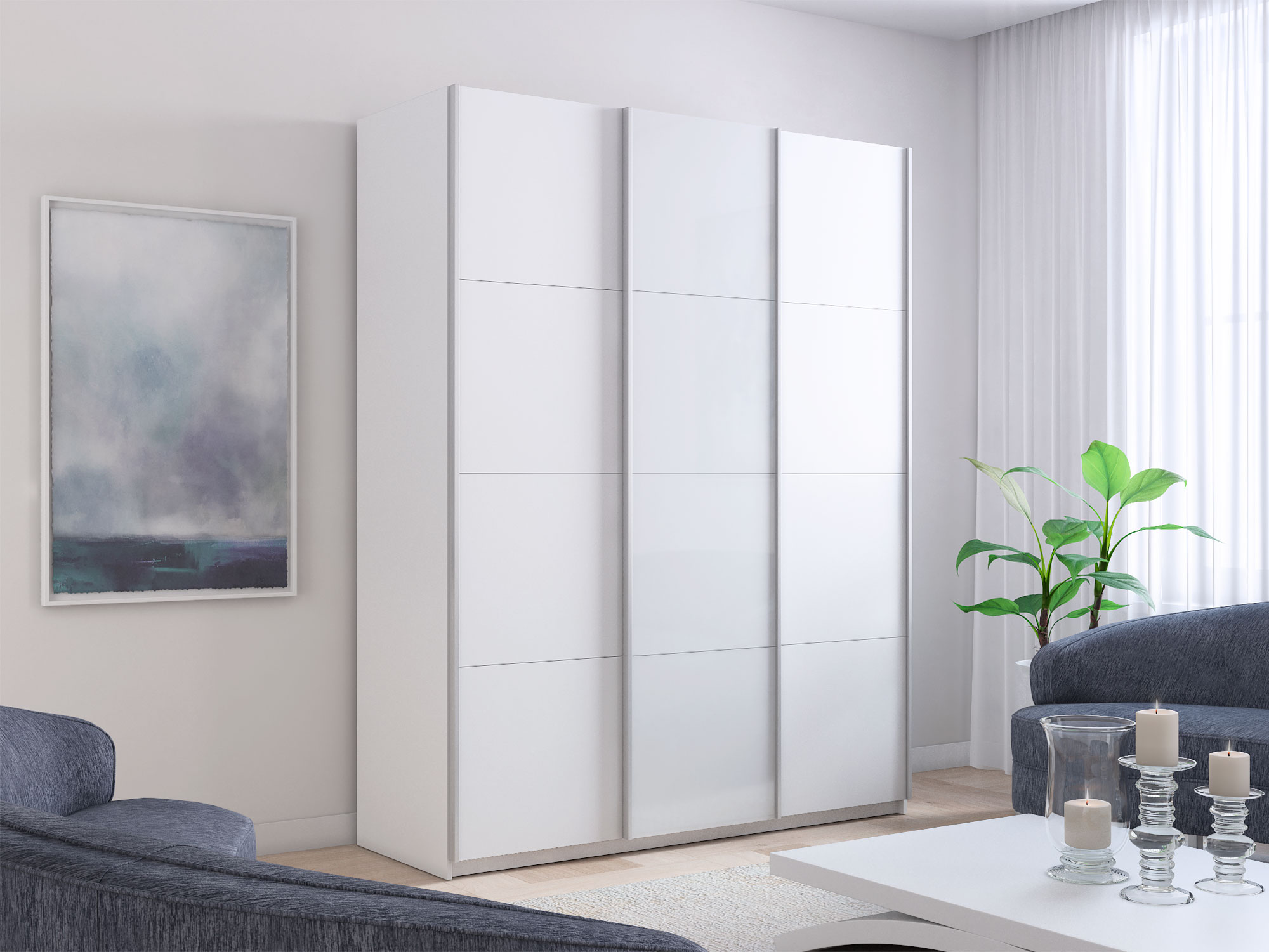 - Шкаф-купе Прайм 3-х дверный 2100 ДСП/Стекло Белое/ДСП Белый Снег