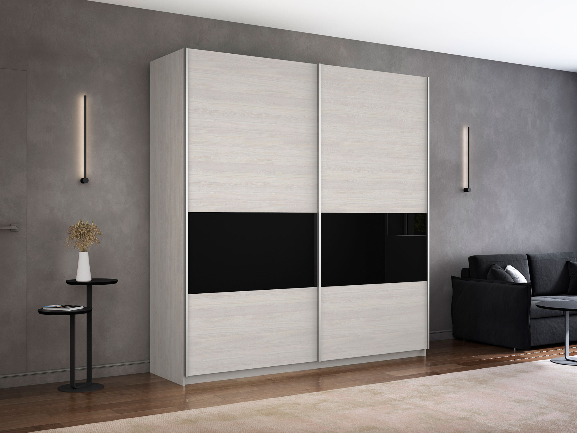 Шкаф-купе Прайм Широкий 2-х дверный ДСП/вставки Стекло Черное Ясень Анкор Светлый