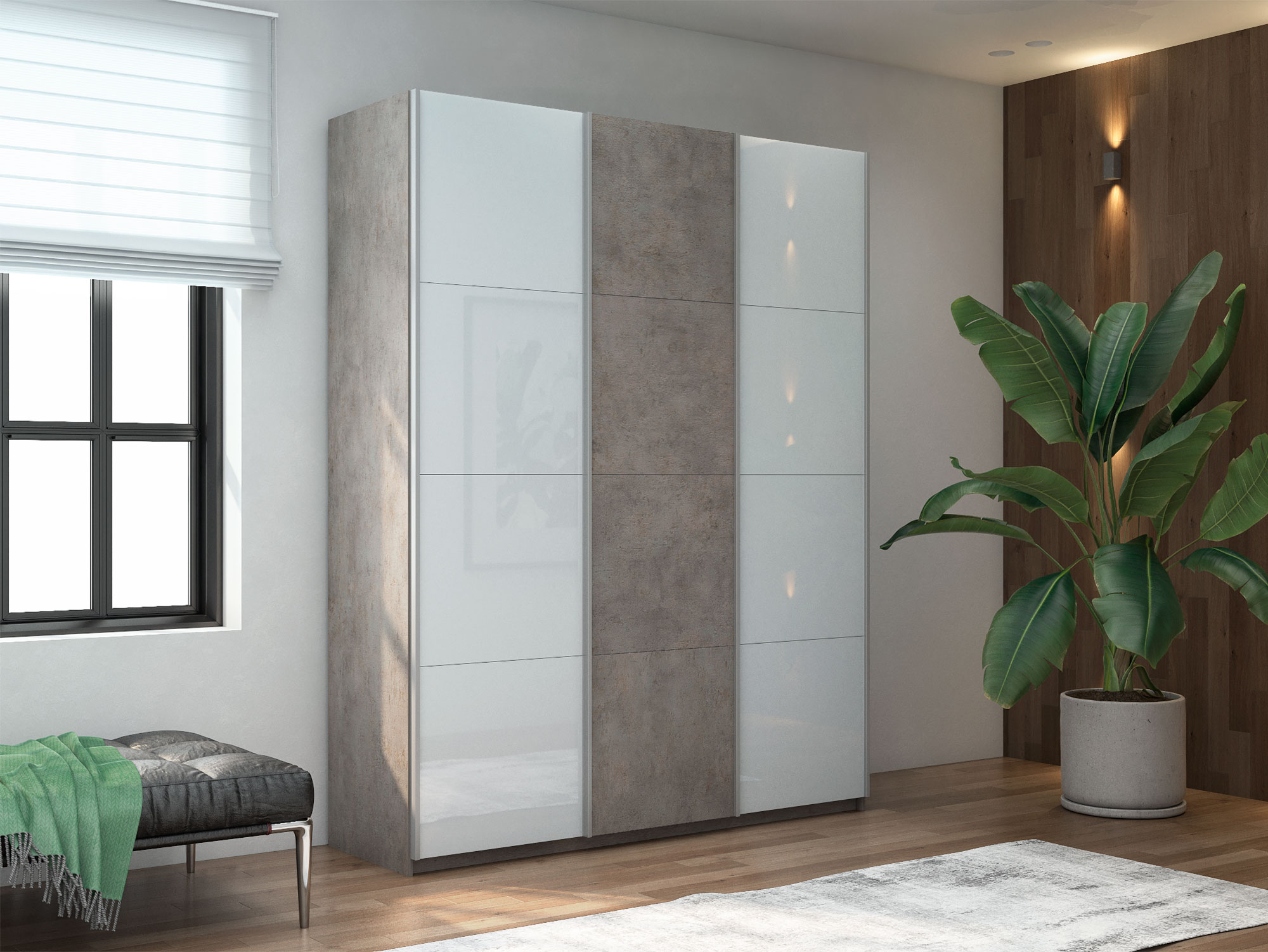 Шкаф-купе Прайм Широкий 3-х дверный два белых стекла/ДСП Бетон