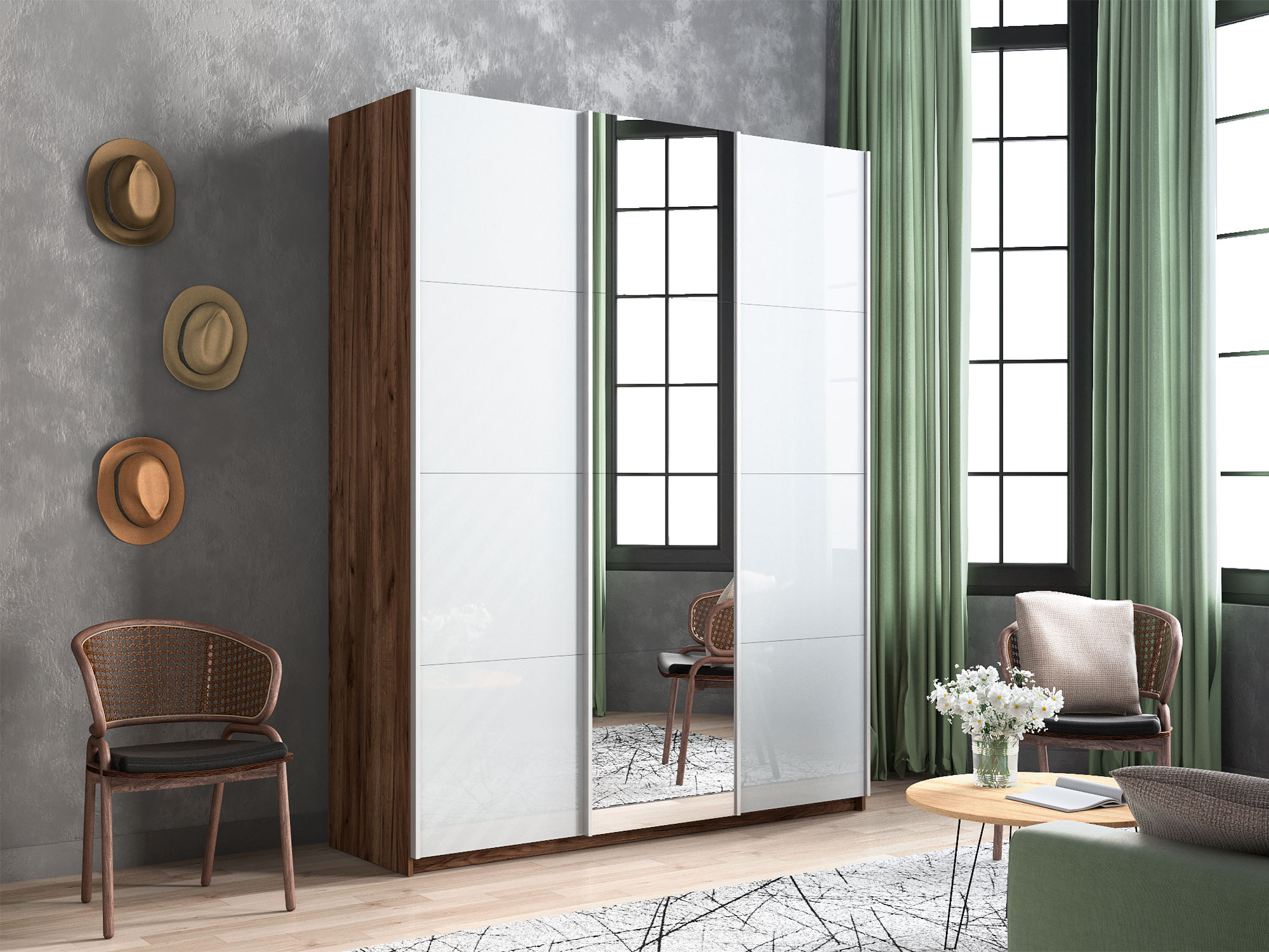 - Шкаф-купе Прайм Широкий 3-х дверный два белых стекла/зеркало Крафт табачный
