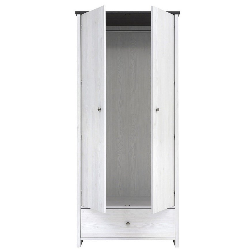 Шкаф содержит один выдвижной ящик и одно закрытое отделение. За распашными дверями расположена штанга для вешалок. Шкаф оборудован небольшими круглыми металлическими ручками серебристого цвета. Используются петли Hettich и роликовые направляющие.